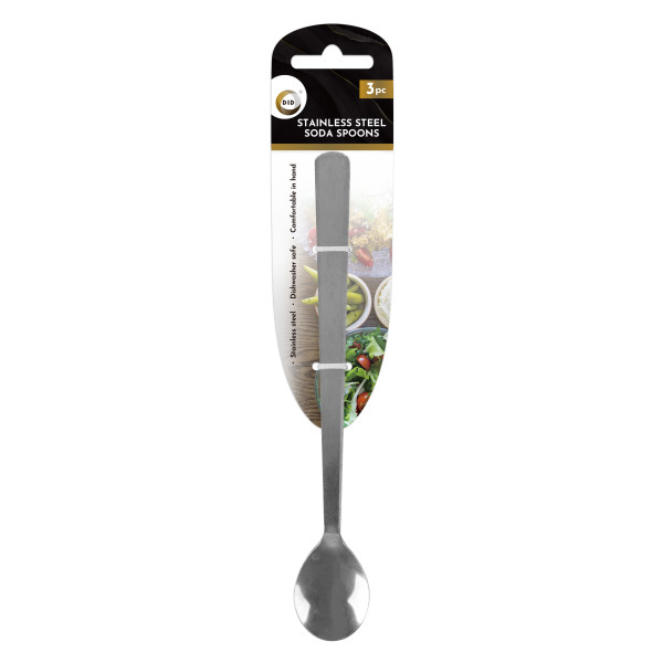 3 Pack of stainless steel soda spoons available in bulk quantities. These are ideal to have in restaurants, parties and more.