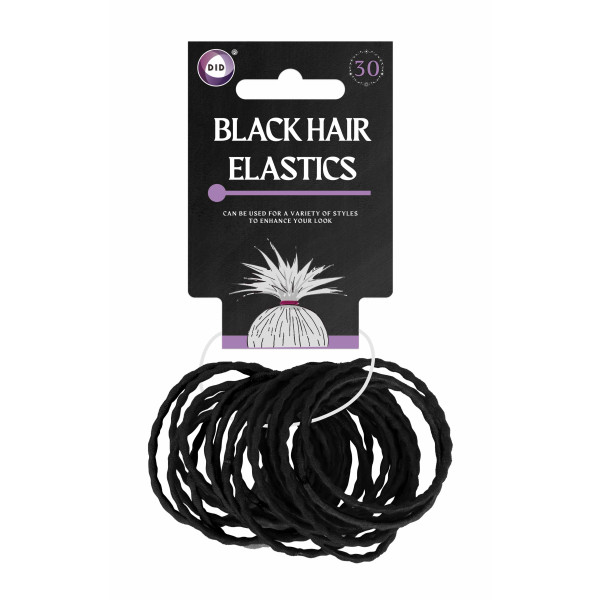 Pack of 30 black hair elastics sold in large quantities. Can be used for a variety of styles to enhance your look.