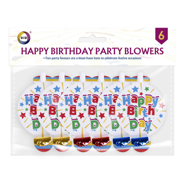 Pack of 6 happy birthday party blowers available in large quantities. Fun party favours are a must-have item to celebrate festive occasions.