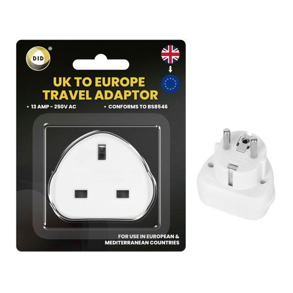 UK to Europe travel adaptor sold in bulk quantities. For use in European and Mediterranean countries. Ideal for tourists from the UK to use their electrical plugs in Europe.