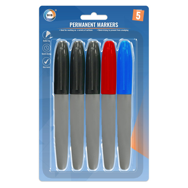 Pack of 5 permanent markers supplied in wholesale quantities. These are ideal for marking on a variety of surfaces. Quick drying to prevent from smudging.