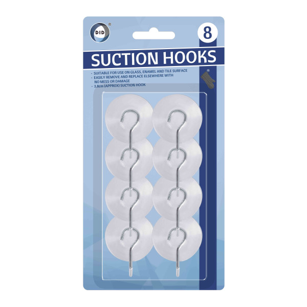 Pack of 8 3.8cm suction hooks available in wholesale quantities. Suitable for use on glass, enamel, and tile surfaces. Easily remove and replace elsewhere with no mess or damage.
