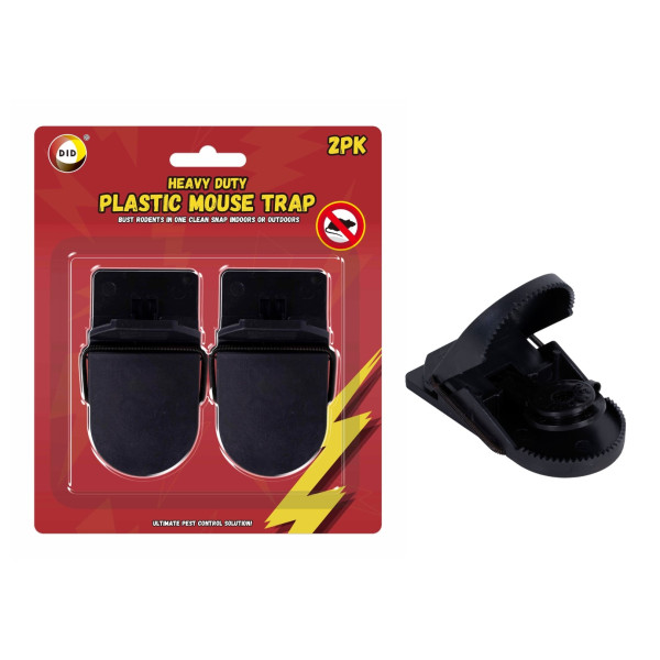 Pack of 2 heavy duty plastic mouse traps supplied in wholesale quantities. Busts rodents in one clean snap indoors or outdoors.